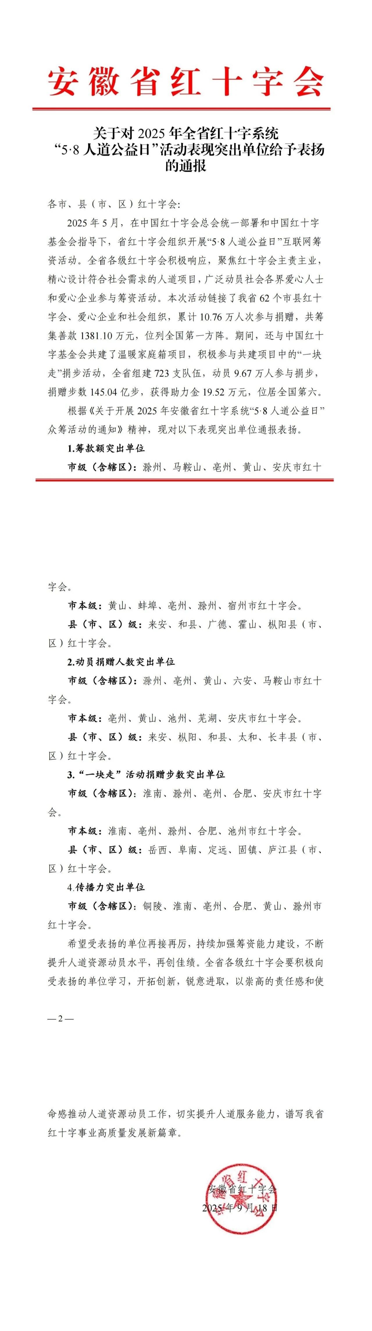 近日,安徽省红十字会对2025年全省红十字系统“5·8人道公益日”活动表现突出单位给予通报表扬。广德市红十字会荣获“筹款额突出单位”表扬。