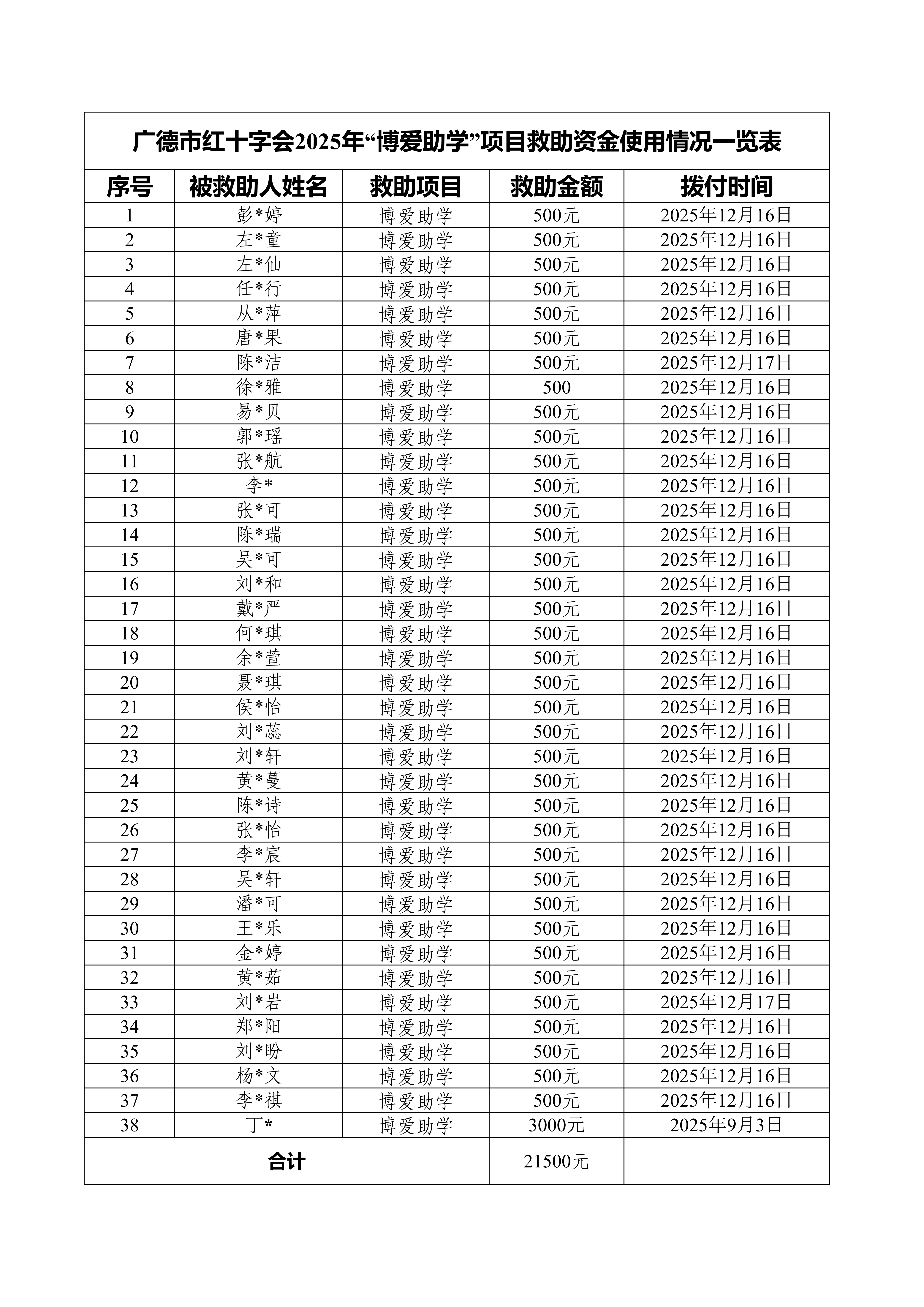 广德市红十字会2025年“博爱助学”项目救助资金使用情况公示